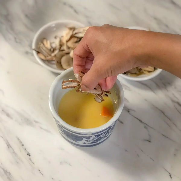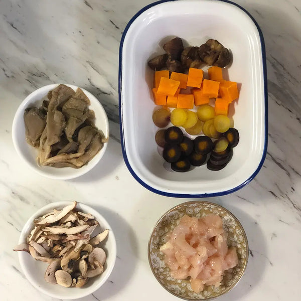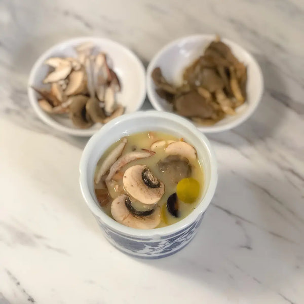 Now, let's talk about the magic that happens with the custard. It all begins with a blend of eggs, dashi, along with a hint of soy sauce and mirin. However, the real excitement unfolds when you introduce the ingredients. Common additions include sliced shiitake mushrooms, plump shrimp, tender chicken, Kamaboko (fish cake), ginkgo nuts, and mitsuba (Japanese parsley). It's like a symphony of flavors in a tiny vessel. This time, we're introducing an autumn-inspired chawanmushi recipe!