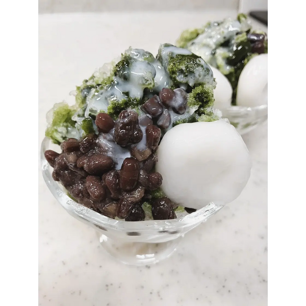 Uji Kintoki is usually topped with toppings such as Shiratama Dango (Mochi balls), sweetened red beans, and condensed milk.