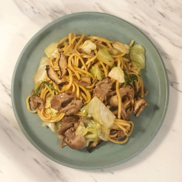 In this recipe, we’ll be showing you the most classic version of yakisoba that you can make in the comfort of your own home. We’ll add thin slices of pork, cabbage, green onions, and shiitake mushrooms to our yakisoba, and finish it off with a delicious homemade yakisoba sauce.