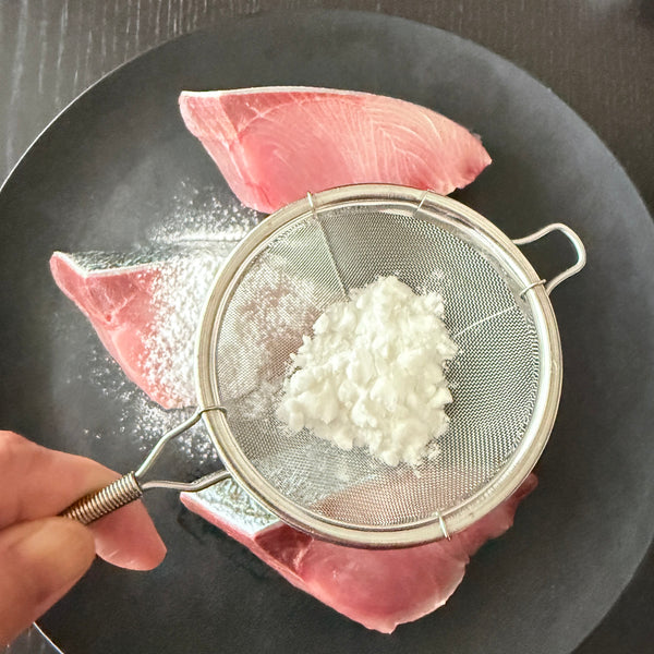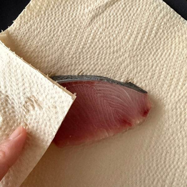 3. Dipping into hot water – prepare a bowl of hot water and dip the yellowtail fillet for a few seconds. Transfer immediately to cold water, remove any dirt with fingers, then pat dry with paper towels. This method also tightens the flesh, preventing the fish from breaking while cooking.