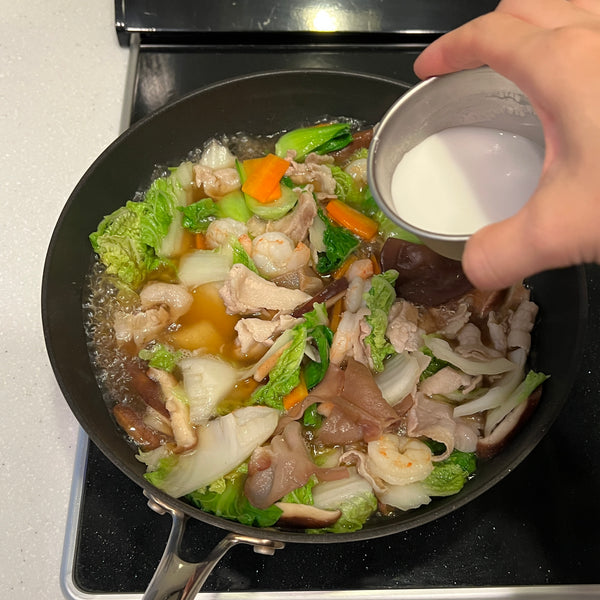 Though the combination of ingredients can vary, chukadon typically includes pork, seafood like shrimp and squid, vegetables such as carrots, Chinese cabbage, and wood ear mushrooms, and boiled quail eggs. You can also customize it with other ingredients like young corn, green peppers, shiitake mushrooms, or bamboo shoots.