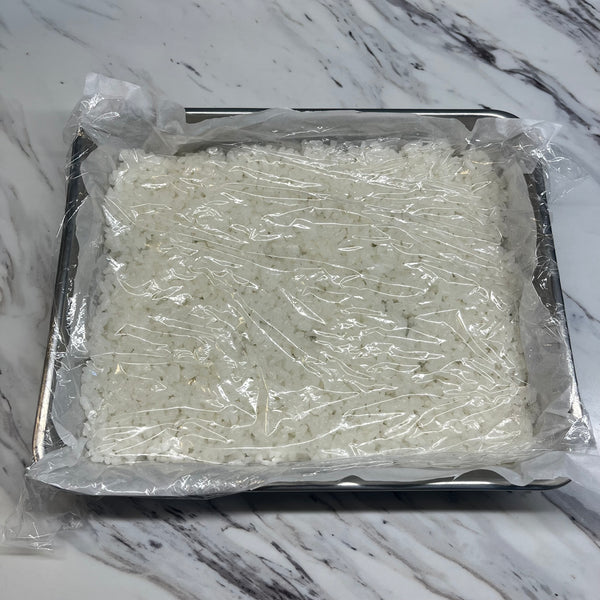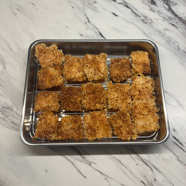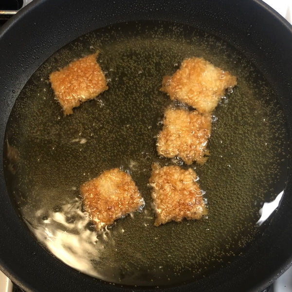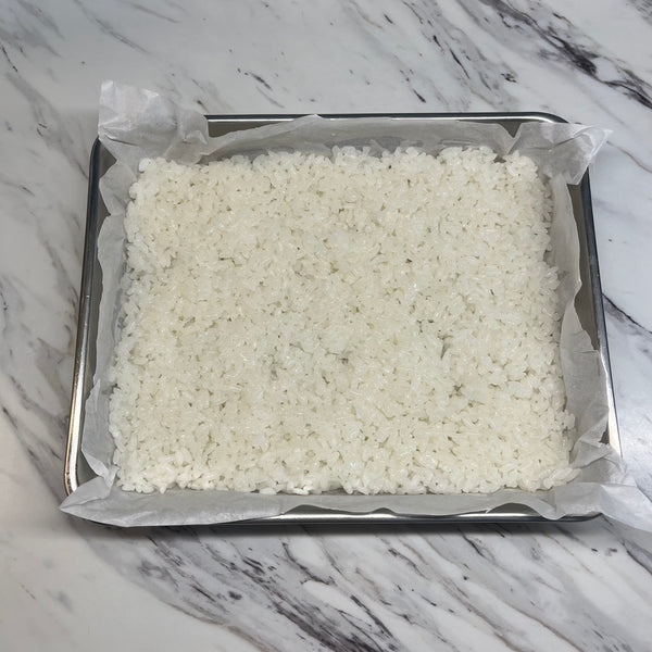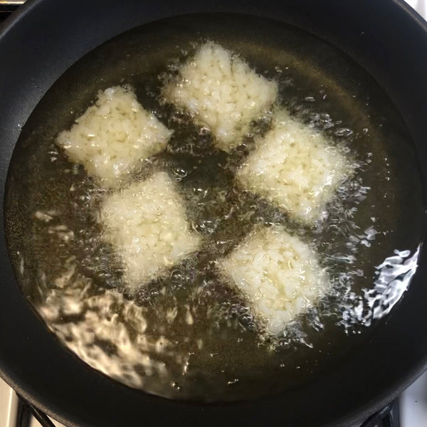To make it at home, press cooked and seasoned sushi rice into a flat layer, chill it until firm, then cut it into bite-sized squares or rectangles. Fry each piece in oil at around 175–180°C (350–360°F) for 3–4 minutes per side, until evenly crispy. Chilling the rice beforehand helps it hold its shape and gives it a better crunch.
