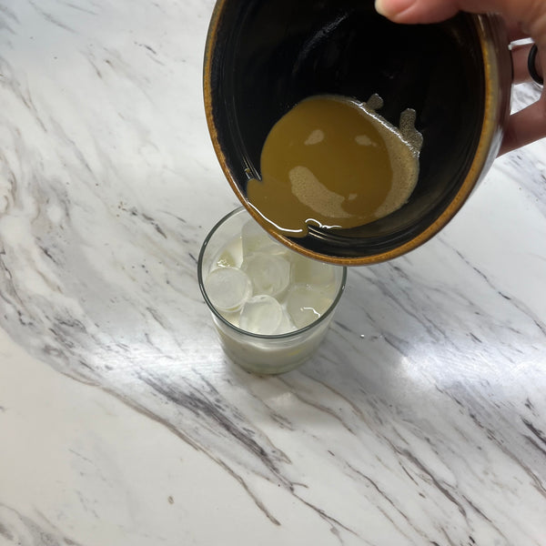 Gently pour the whisked hojicha mixture over the milk and ice.