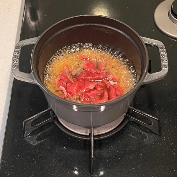 In a pot, combine sugar, soy sauce, sake, mirin, and water. Bring it to a boil. Then, add thinly sliced beef and julienned ginger. Cook for 4-5 minutes, ensuring the slices are spread to avoid overlapping.