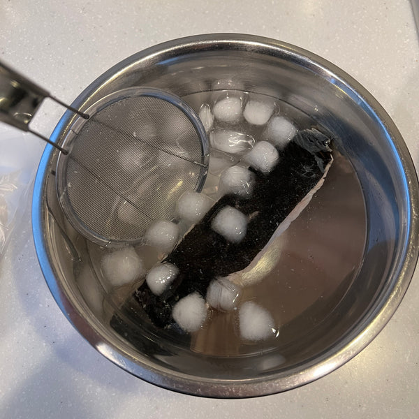 Do “shimofuri” as preparation: Shimofuri is a Japanese technique where fish is briefly soaked in boiling water until the surface turns white. This process helps remove any odor and makes it easier to remove the scales.