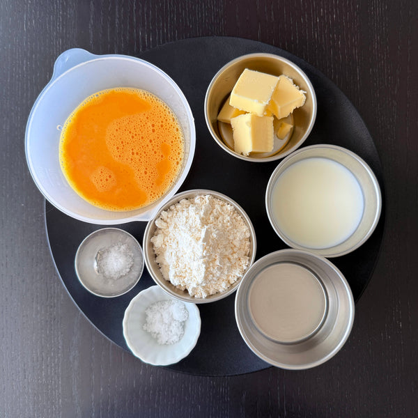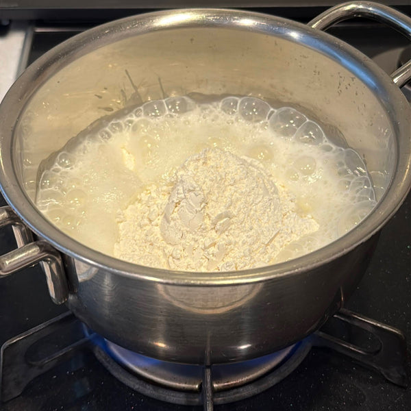 계란: 풀어놓은 달걀을 반죽에 점차적으로 첨가하고, 반죽이 올바른 농도에 도달할 때까지 잘 섞습니다. 모양을 유지할 수 있을 만큼 단단하지만 파이핑을 할 수 있을 만큼 유연합니다.